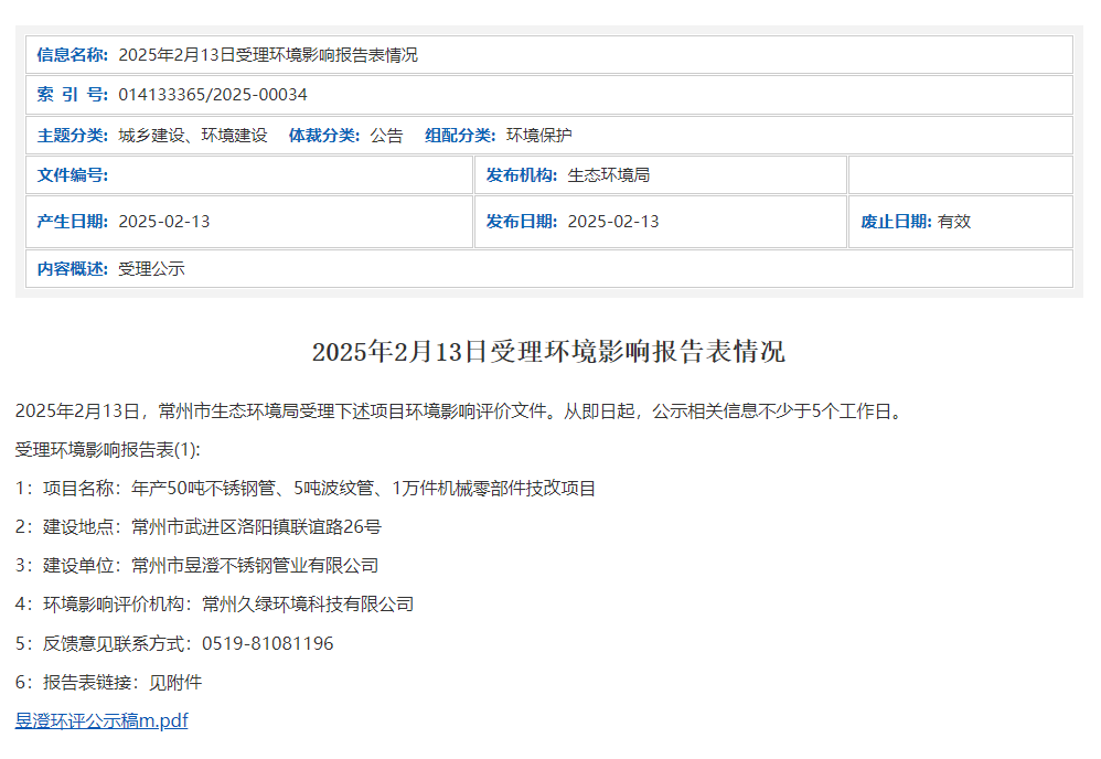 2025年2月13日,常州市生態(tài)環(huán)境局受理常州市昱澄不銹鋼管業(yè)有限公司年產(chǎn)50噸不銹鋼管、5噸波紋管、1萬件機(jī)械零部件技改項(xiàng)目環(huán)境影響報(bào)告表并對外進(jìn)行公示,公示期:從即日起,公示相關(guān)信息不少于5個(gè)工作日。